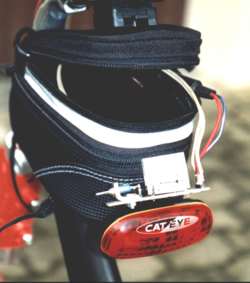 Die Satteltasche beinhaltet den Akku mit "Elektronik" (ein einfaches Relais, welches bei unterschreiten einer Erregerspannung selbstständig die Lampe abschaltet; damit ist ein Tiefentladen verhindert).