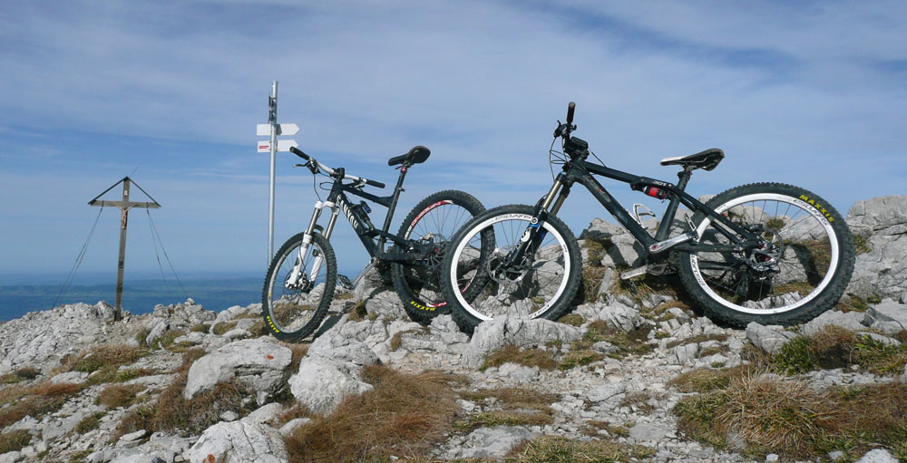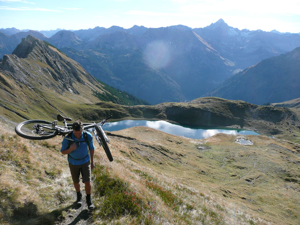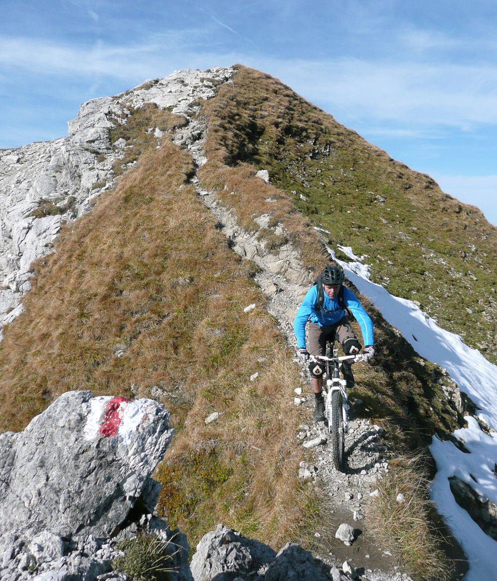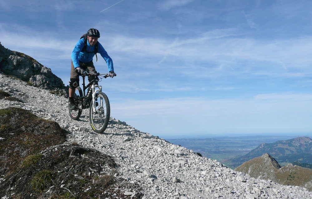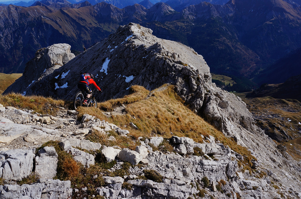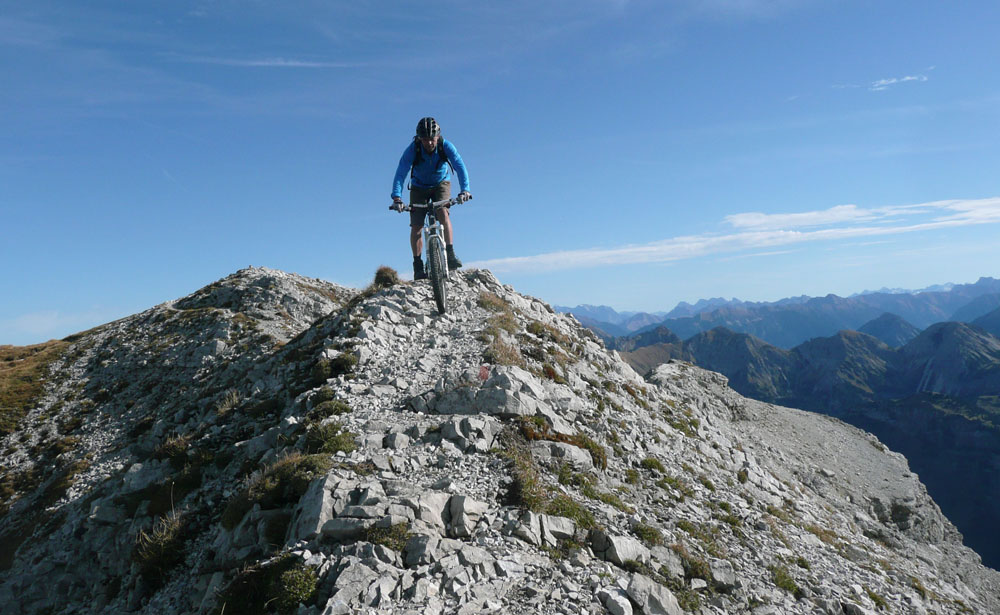 der Herbst 2003 zweigte sich meist nicht so von seiner allerbesten Seite. Es gab nur wenige Gelegenheiten für knackige Hochtouren. Die letzte fast schneefreie Option haben Michael und ich nochmal genutzt, um die felsigen Kalksteinberge im Allgäu zu erkunden. Jeder von uns war schon mal auf vielen der Nachbargipfel, aber dieser Eine hat uns mit dem Bike irgendwie noch gefehlt.