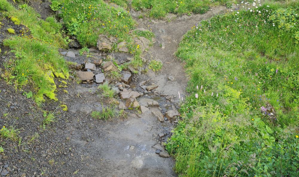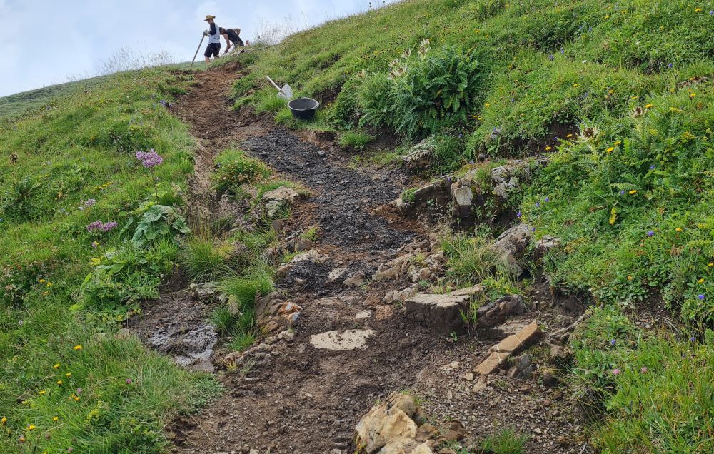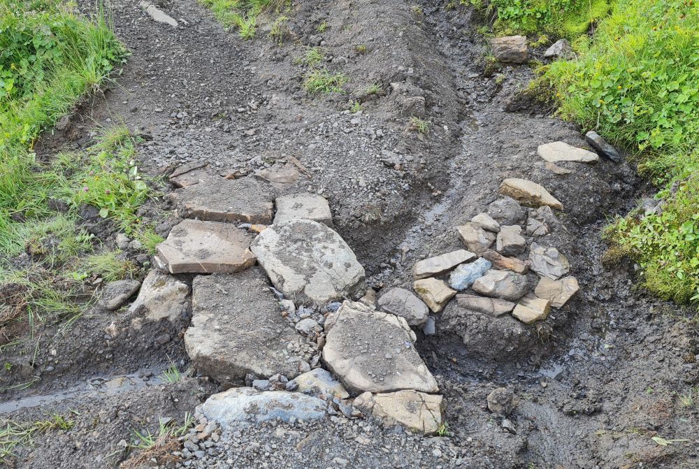 Dafür werden alle paar Meter Entwässerungen gegraben und die talseitige Vegetation abgestochen und am Berg oder in parallel verkaufenden Rinnen wieder eingesetzt. An nassen Stellen und kleine Bächen bauen wir Brücken aus Felsplatten und Drainagen aus Steinen. In Zukunft kann man hier durchgehen und fahren, ohne durch den Matsch zu müssen.
